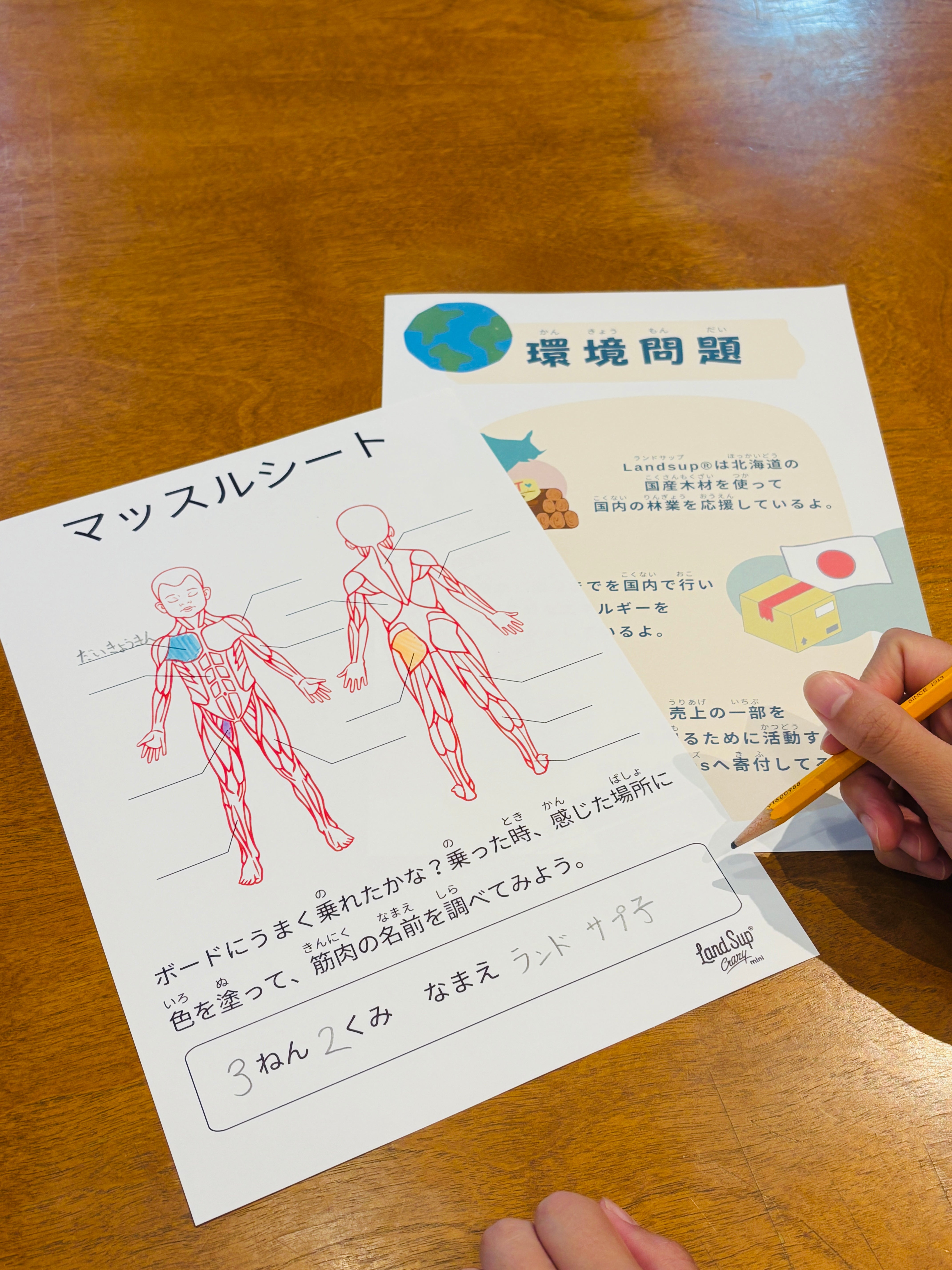 ボードに乗って刺激を感じた筋肉の名前を書き込めるマッスルシート。